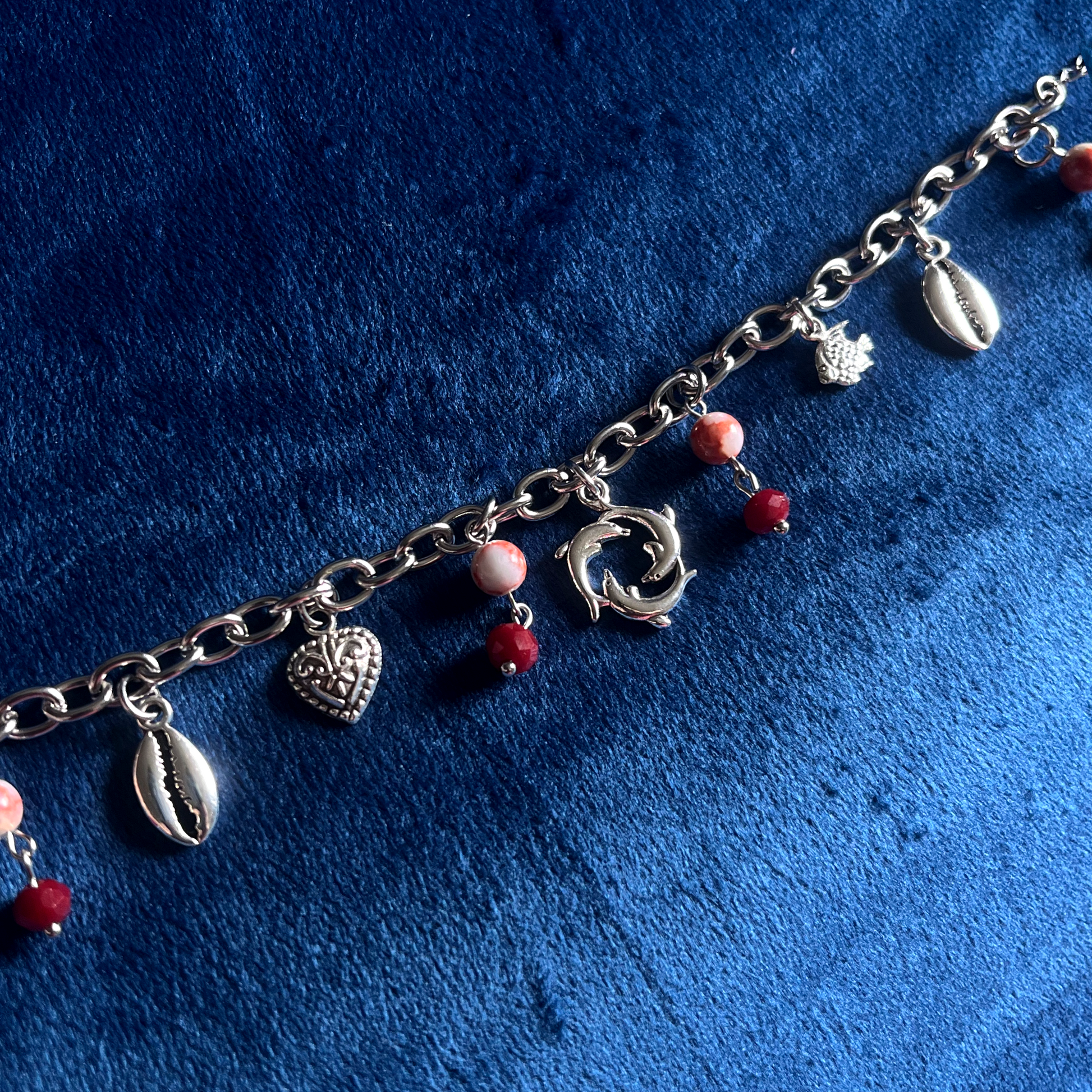 The three dolphin charm in this piece inspired the name. In tarot, the 3 of cups card is one of celebration, friendship, and happiness.