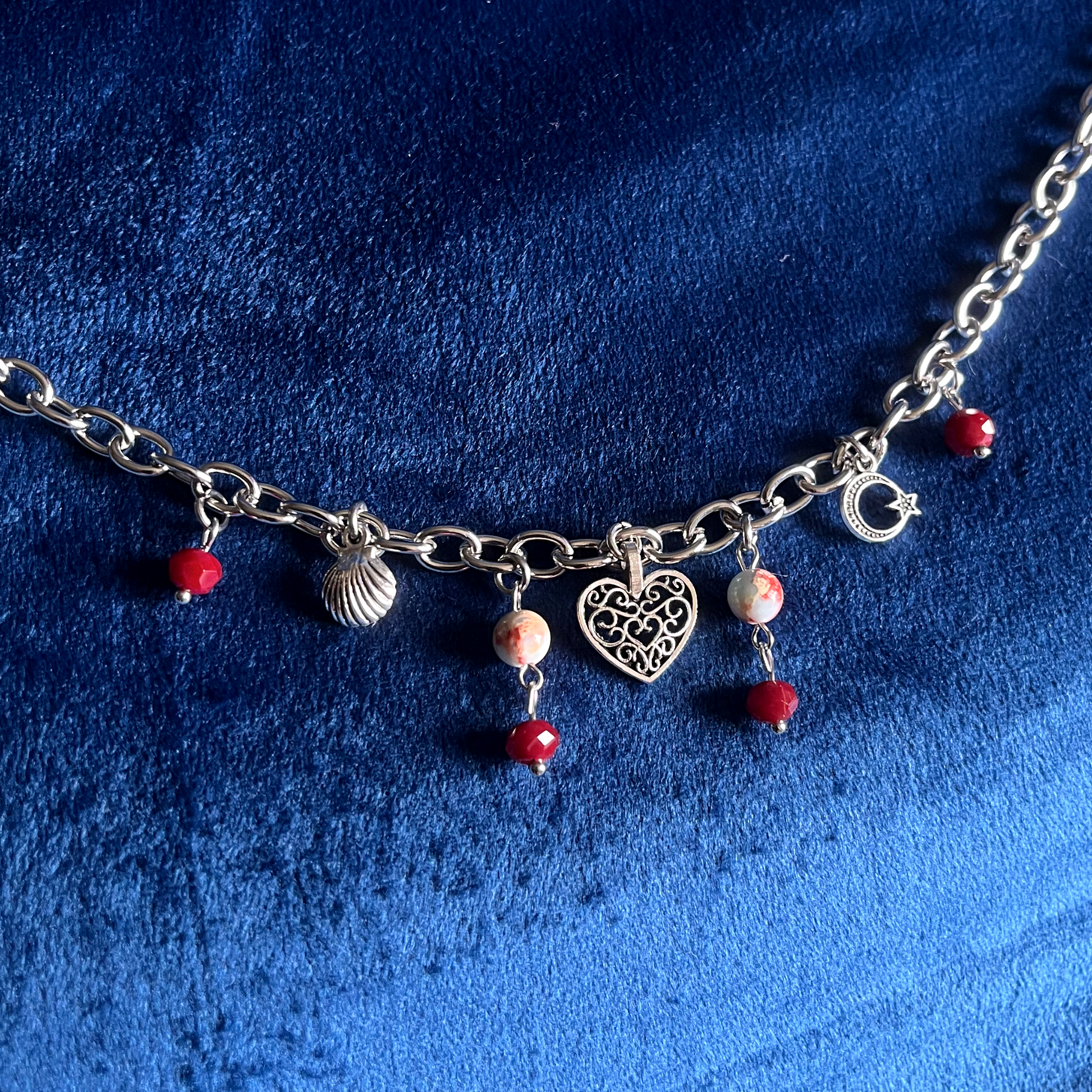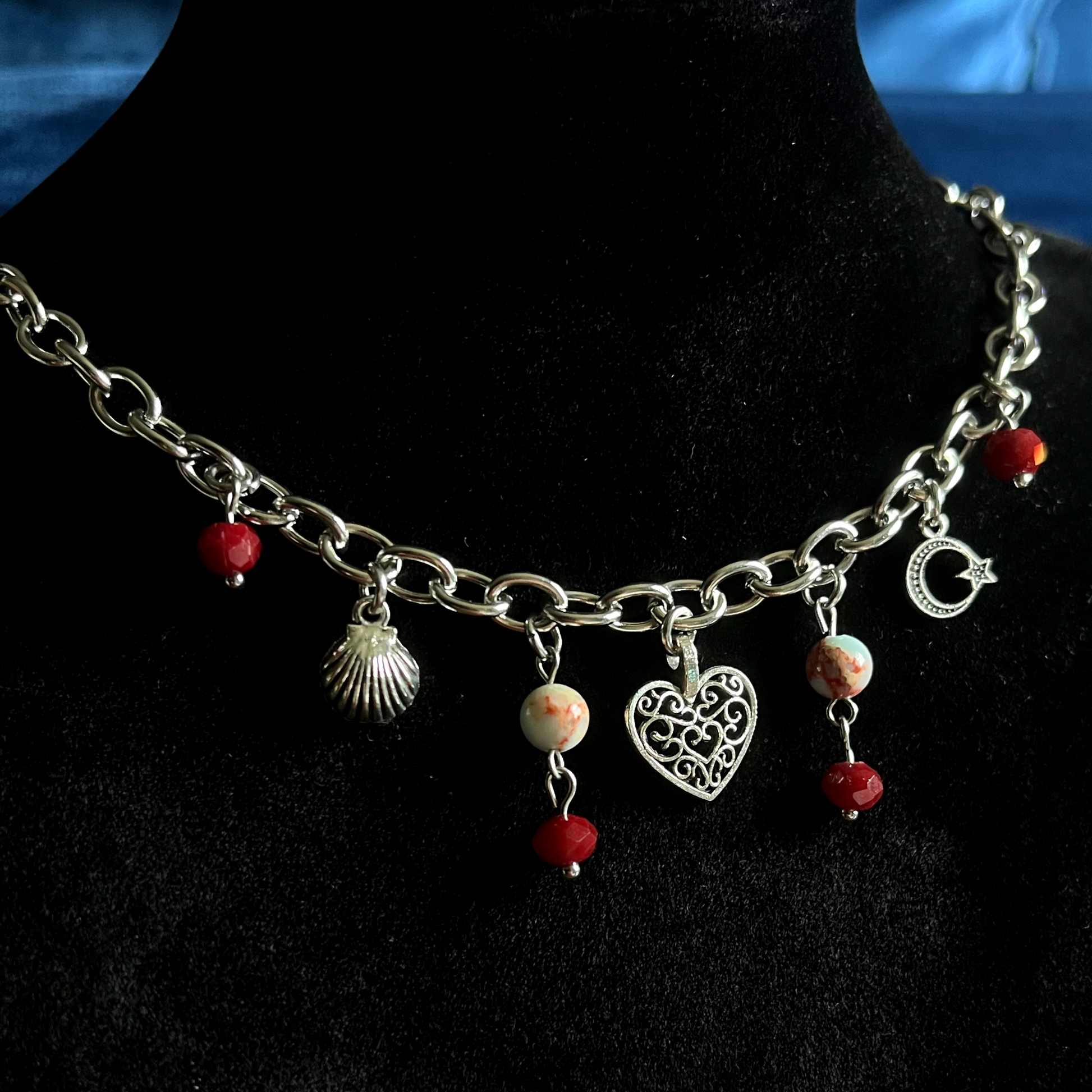 - Tibetan silver charms, blue sky jasper, glass beads, and stainless steel chain and findings.